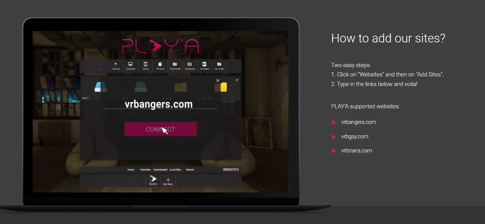 Als je bijvoorbeeld een abonnement hebt op VR Bangers kan je deze super makkelijk connecten aan de Play'a app.